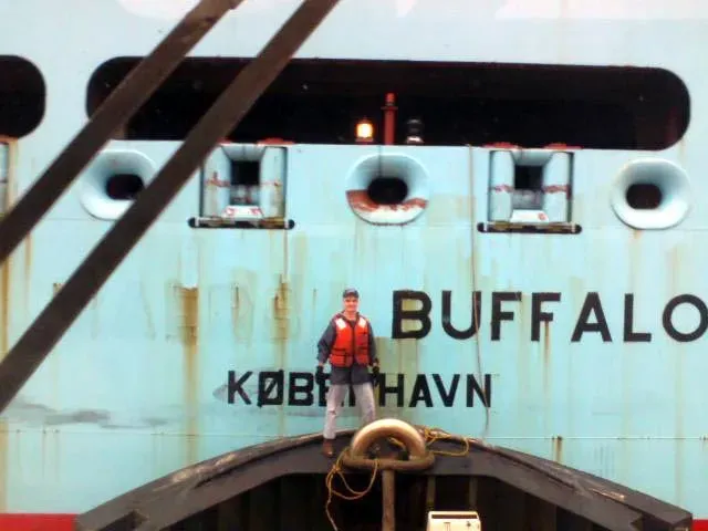 Deckhand Mark Hannon sent this picture of himself standing on the bow of the tug Surrie Moran in the Baltimore Harbor. The ship being docked is the MSC Buffalo, formerly the Maersk Buffalo out of Copenhagen. The tug's Captain photographed Mark from the tug's wheelhouse one fine fall day.